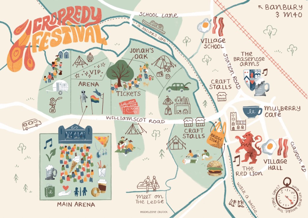 I draw the buildings, characters, wildlife and trees carefully, taking note of stone colour and features unique to the sense of place. This could include local secrets that help people feel seen if they are ‘in the know’, or elicit curiosity in those that don’t. For example, the event map for Fairport’s Cropredy Convention features an alien flag that a particular fan brings every year, and other fans use as a landmark to meet friends. I was honoured to receive a heartfelt letter from the owner of this flag. I hand letter the typography, add any banners or symbols needed, and create a title. Every map has a compass to indicate North.
