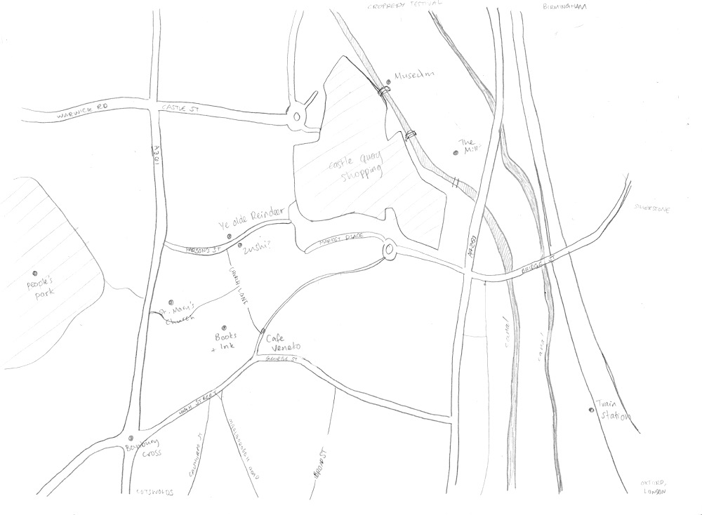 I use various map tools to layout the area, marking in roads, rivers and grassy areas. Google maps is again great for this, but it’s also useful to use map tools from councils and ordinance surveys. At this stage I have a rough idea for positions of landmarks, but since they are created digitally most of the time, in contrast to my narrative illustrations, it is simple to move or swap them at a later date.