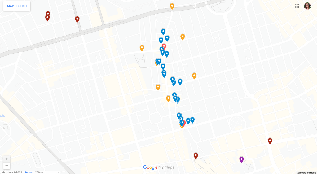 After receiving a commission for a map and establishing contracts and payment, I start with researching the location and the client’s needs for the project. If it is accessible, I visit the location and make sketches and photographs of various landmarks, spending time in the area to get a sense of place and story. If the location is far away, I rely on a mix of google maps street view, any photographs the client has, and online images.