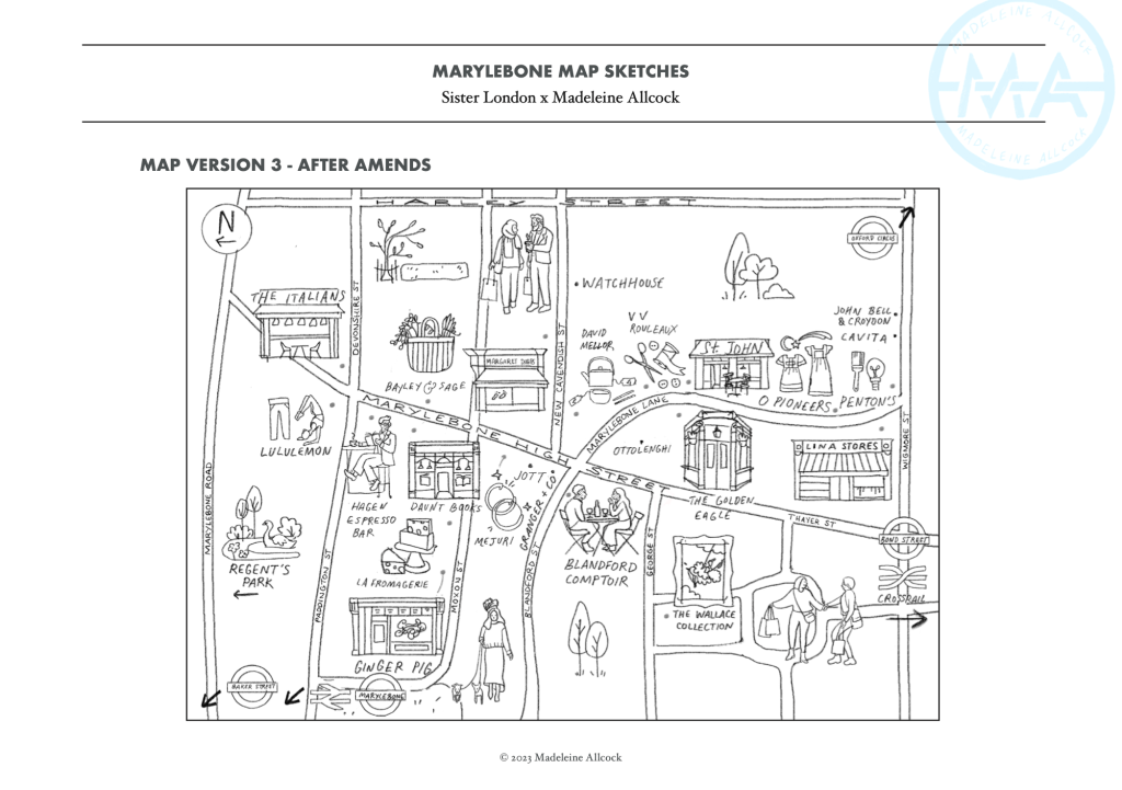 Due to this variety, each map requires a different approach, tailored to the needs of the commissioner. For example, an illustrated city map celebrating a sense of place for a gift shop has an emphasis on popular landmarks, activities and local stories. A map for a heritage organisation might require all roads and connections to be clearly visible and useful for planning walking routes. An event map designed with children and families in mind will be different to an estate agent’s map aimed at promoting their ‘patch’ to young working professionals.