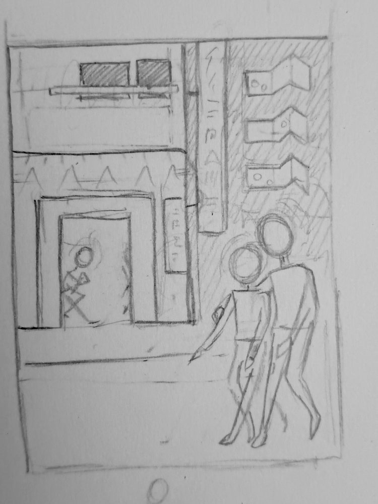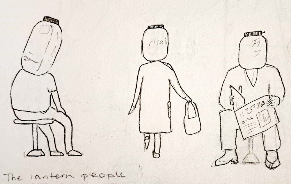 Racking my brains for ideas and getting nowhere, I turned to stock photography to at least practice drawing cityscapes, as I had a vague idea that a city is a good starting point for futuristic artwork. While browsing, one photo stood out to me, of a man obscured behind a lantern in a crowded Tokyo street. I thought his head looked like it was the lantern itself, and I sketched characters with this idea. However, the idea of the lantern heads didn’t feel right, partly because of the cultural associations with paper lanterns. I might explore the idea in the future, but it would need a clear reason for being there. I expanded the idea, and made the heads glowing light orbs instead.