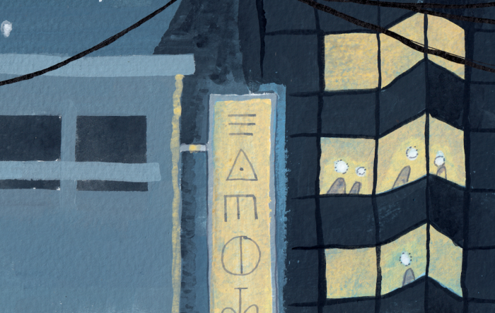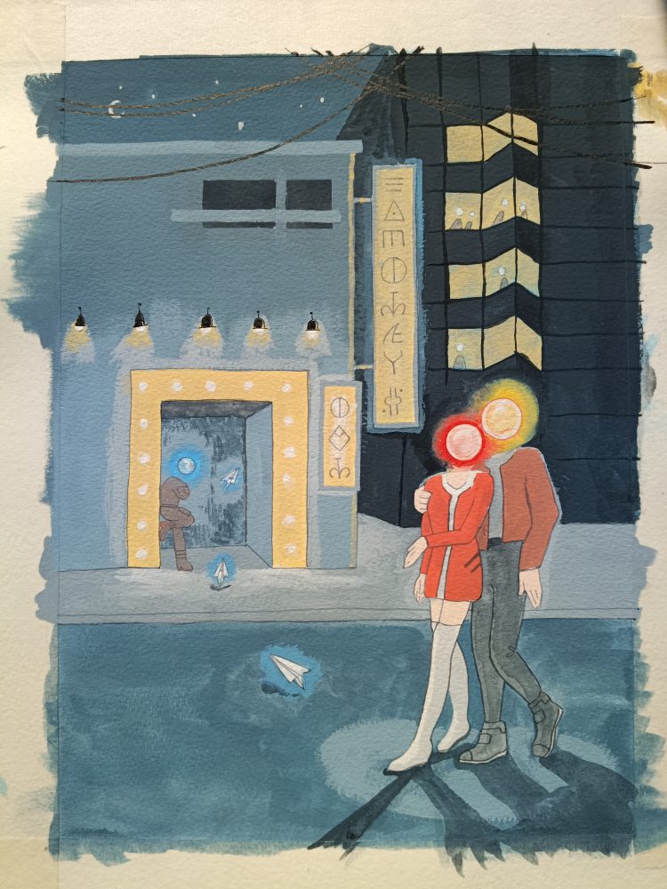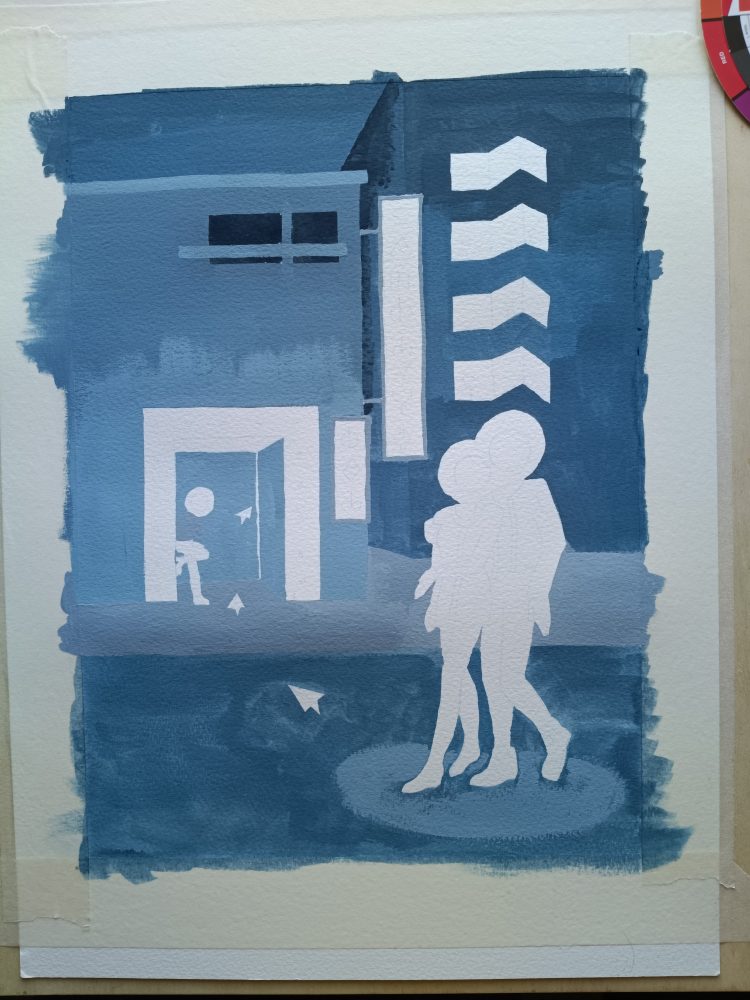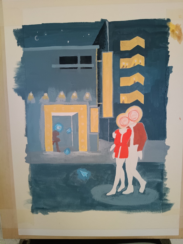 The background is created with a mixture of blue, black and white gouache to create a monochromatic city. Blue feels colder and more alive than grey on its own, which can feel flat. I used a square shape brush to get sharp edges. I layered more paint on top until the contrast looked right, keeping in mind that the couple and lights should stand out.