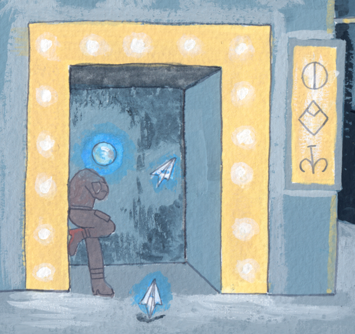 This painting, Night Life, shows a couple with glowing orbs for heads outside a theatre in a city. Their heads are warm colours, in contrast to the muted blue-grey background and distant character. Electronic paper planes drift through the scene, and the signs are written in a futuristic language. It’s designed to lead the eye straight to the couple, then to the doorway, along the sign and back to the couple again.
