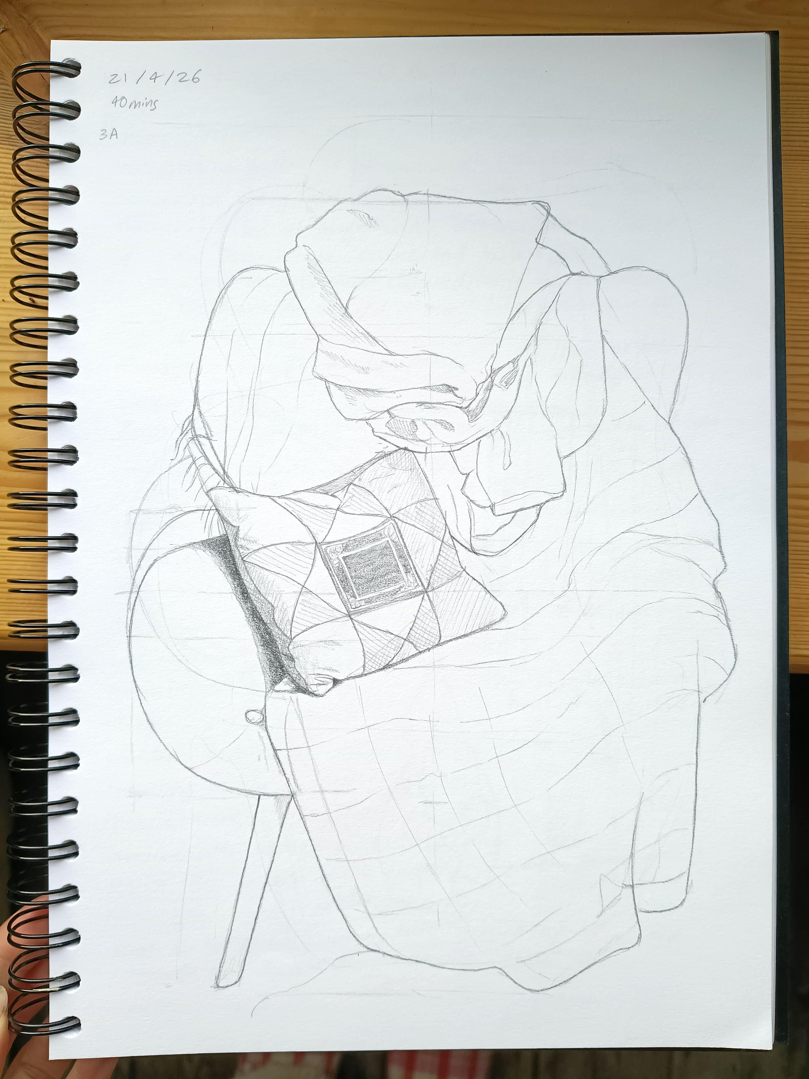 Drawing from photos didn’t feel like the answer. It’s too easy to copy shapes without really seeing, and the results can feel flat. I wanted something that would still challenge me to observe properly. After thinking it over, I decided to draw furniture instead. I chose a chair piled with clothes and treated it like a figure. I used the techniques in the book: measuring with a pencil, finding midpoints and checking alignments.